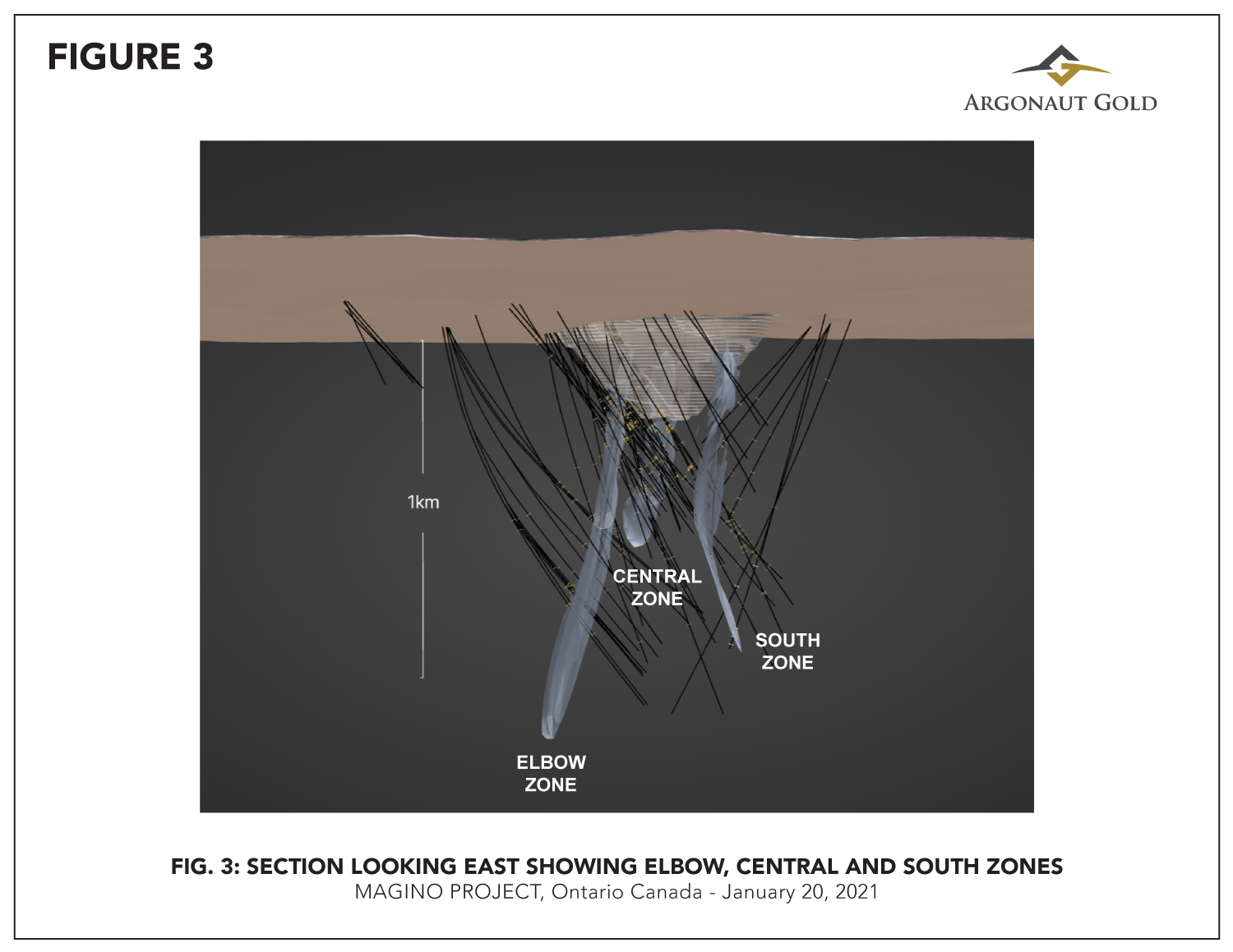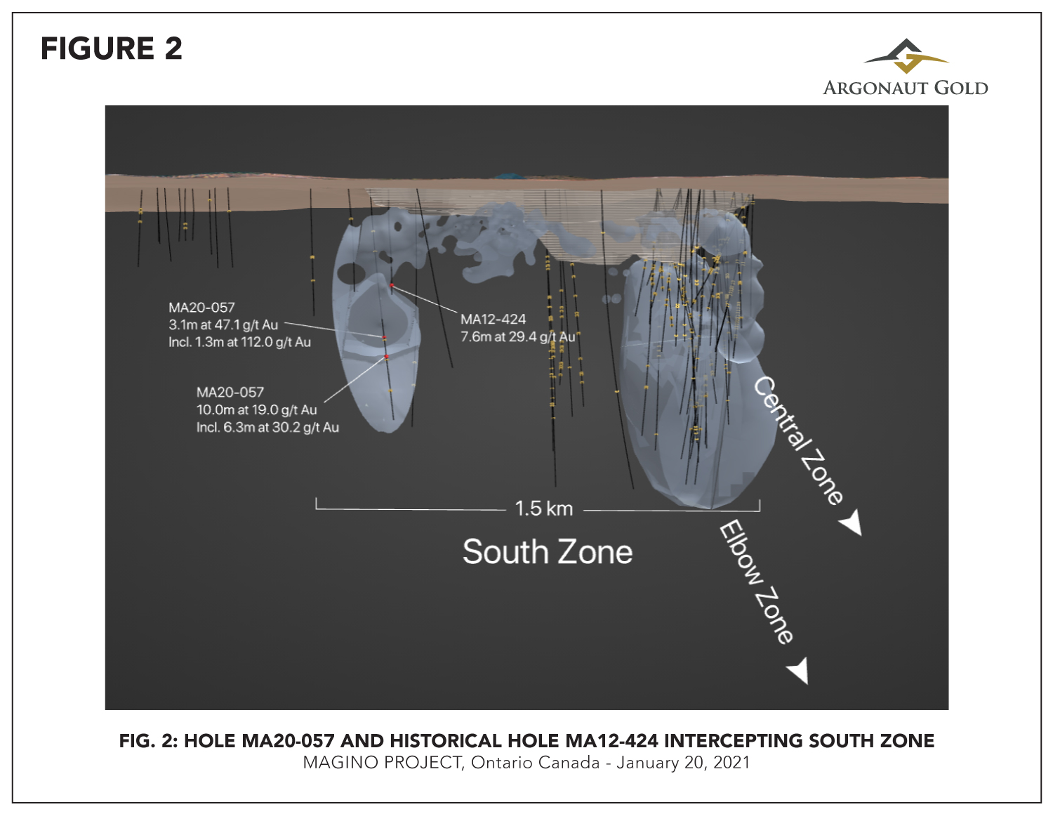TORONTO, Jan. 20, 2021 /CNW/ - Argonaut Gold Inc. (TSX: AR) (the "Company", "Argonaut Gold" or "Argonaut") is pleased to announce that it has intersected 10.0m at 19.0 g/t Au, including 6.3m at 30.2 g/t Au and 3.1m at 47.1 g/t Au, including 1.3m at 112.0 g/t Au in the South Zone at its 100% owned Magino property in Ontario, Canada. The South Zone has now been intersected in numerous drill holes extending from the border between the Island Gold mine and the Magino project westward over a strike length of 1.5 kilometres and remains open at depth and to the west.