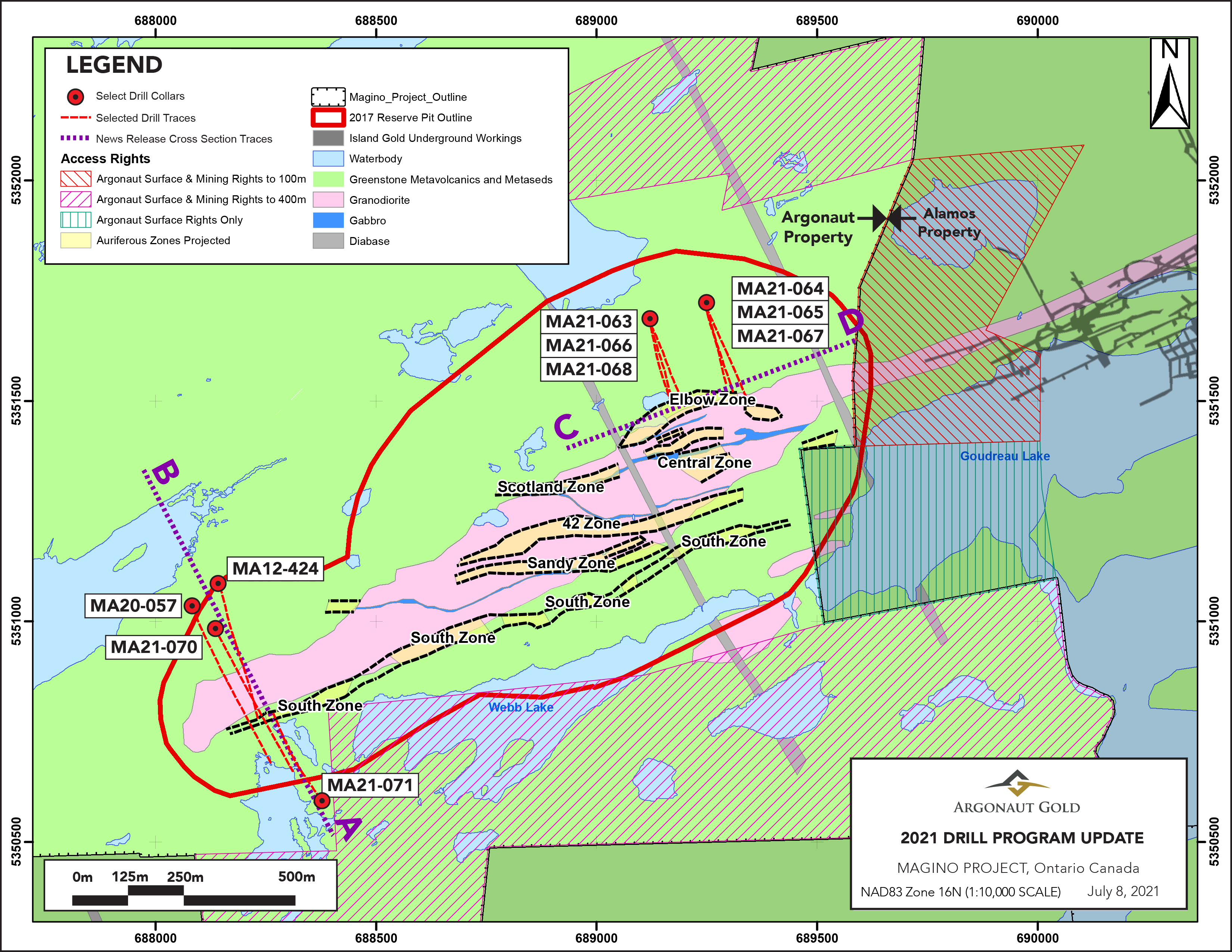 TORONTO, July 8, 2021 /CNW/ - Argonaut Gold Inc. (TSX: AR) (the "Company", "Argonaut Gold" or "Argonaut") is pleased to announce that drill hole MA21-070 has intersected a core length of 7.0m at 13.3 g/t Au approximately 1.5 kilometres west from the border between the Magino property and the Island Gold mine, as a follow-up drill hole to previously announced drill intercept MA20-057 which encountered 10.0m at 19.0 g/t Au in the South Zone at its 100% owned Magino property in Ontario, Canada (see press release dated January 20, 2021).