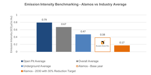 Alamos is already an industry leader in GHG emission intensity with an average of 0.38 tCO2e per ounce of gold produced across its three operating mines (base year 2020/2021), 43% lower than the mining industry average of 0.67 tCO2e per ounce of gold.