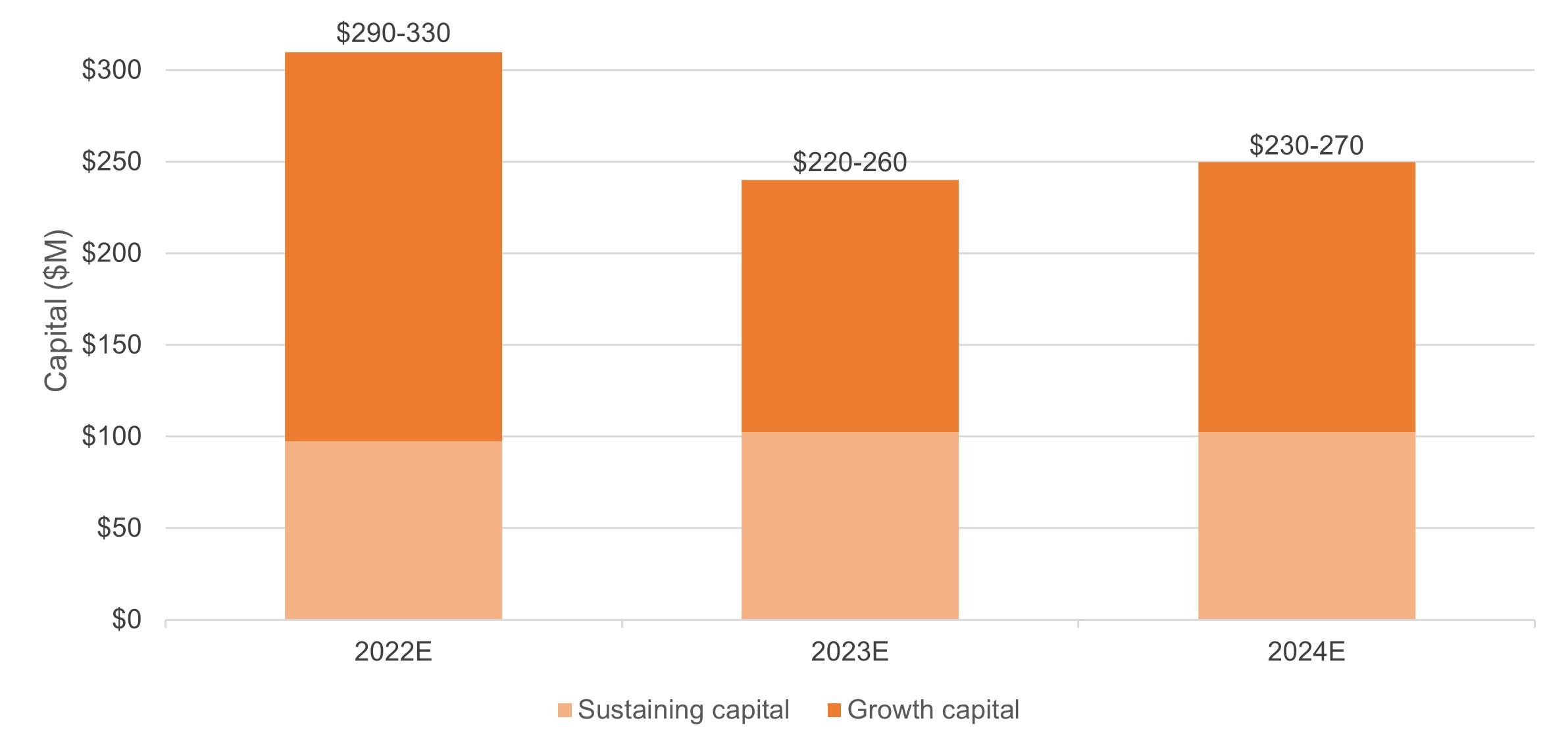 - Sustaining capital guidance of $90 to $105 million: down approximately 17% from 2021, reflecting lower sustaining capital at Mulatos. Sustaining capital is expected to remain at similar levels through 2024
